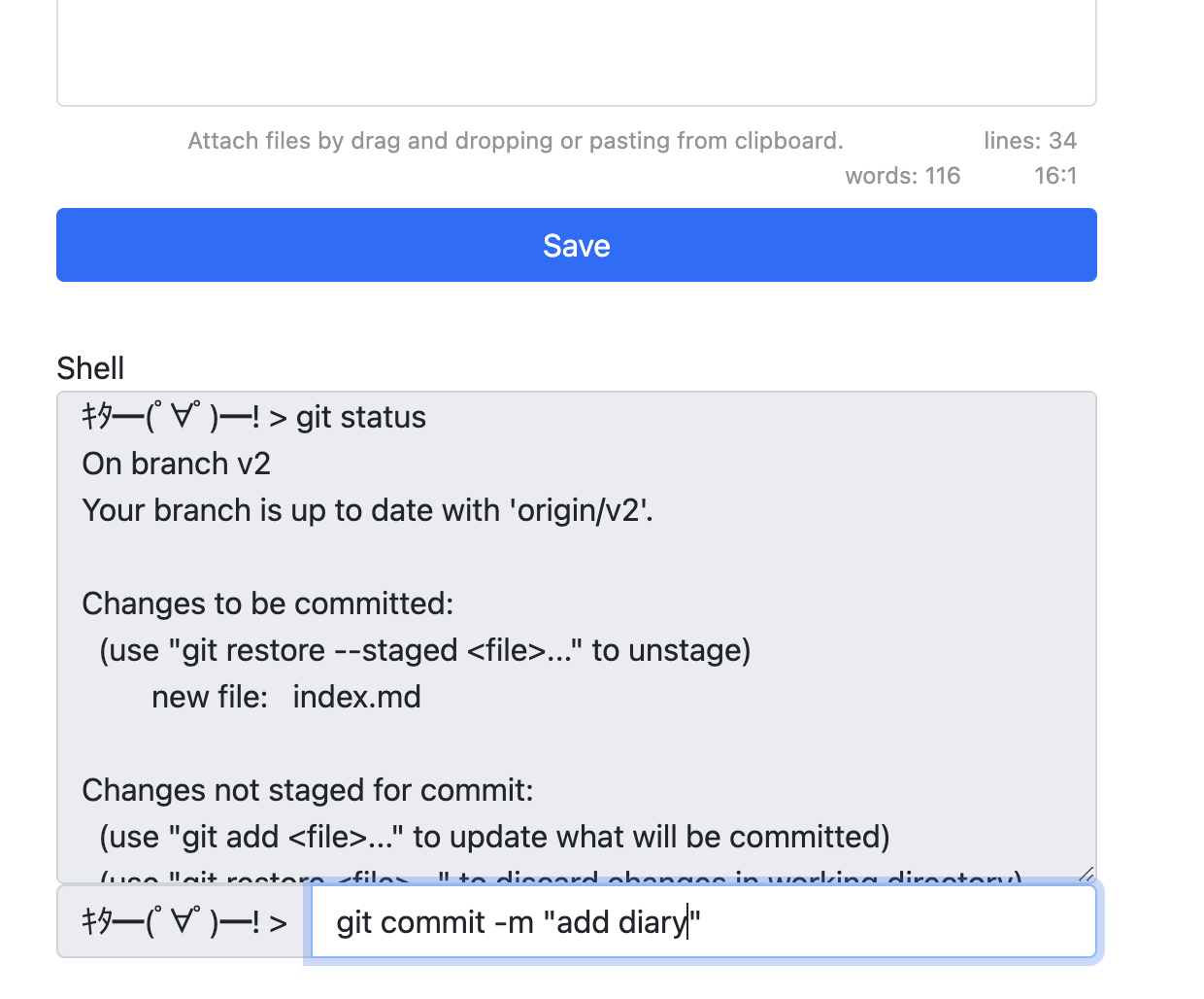 - エディタの下部にshellっぽいのを作った(input要素に入れた文字列をexecで呼び出すスーパーシンプル実装)