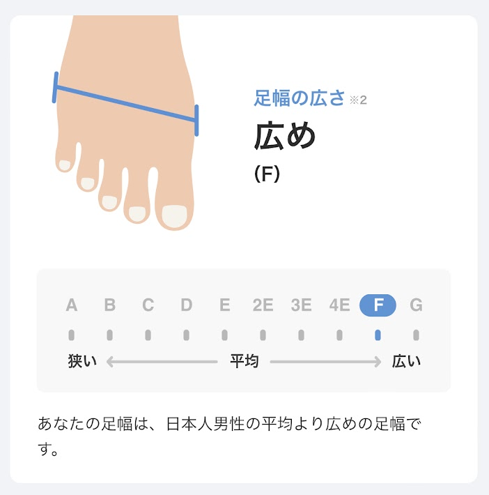 割とちょくちょく買ってるんだけど今回こそは良い買い物ができたはず。なぜなら事前にZOZOTOWNのアプリで足の計測を知ってもらったから!靴を選ぶとき今までは足のサイズ(27.5とか)だけを見ていたけど、ぶっちゃけどの靴履いても今まで痛かった!計測をして分かったのは、どうやら俺の足幅はFだった。Fがどれくらいかと言うと